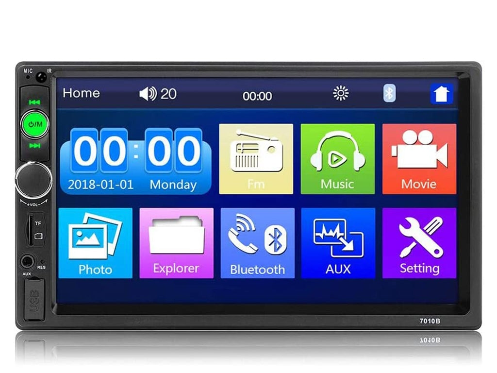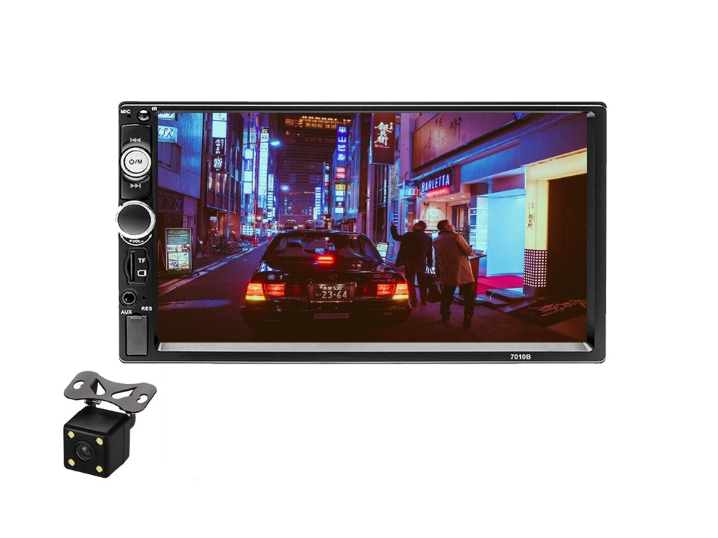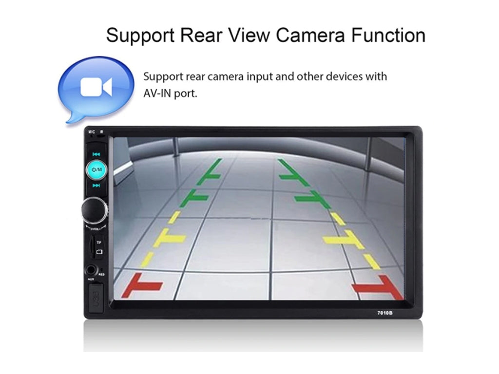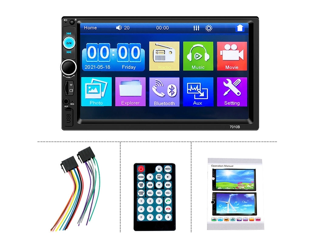 7" Car MP5 player with Bluetooth, NZ FM radio (87.5-108MHz), and mirror link for Android & iOS. Supports amplifiers, subwoofers, and rear-view camera (sold separately or in bundles). Features a 7" touchscreen (800x480), colour-changing buttons, and hands-free calling. Includes USB, MicroSD, AUX, and RCA connections. Universal 2-DIN fit with a wiring harness, remote (battery not included), and user manual.