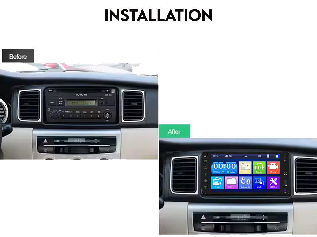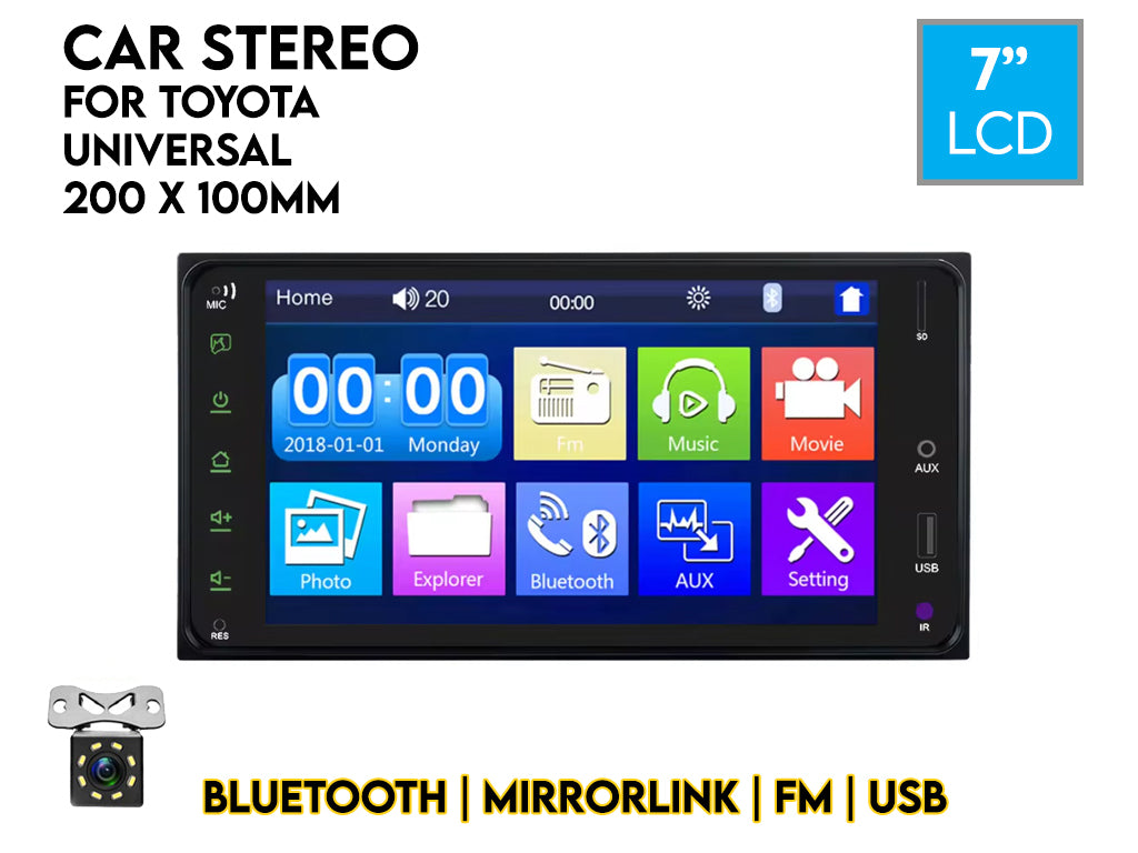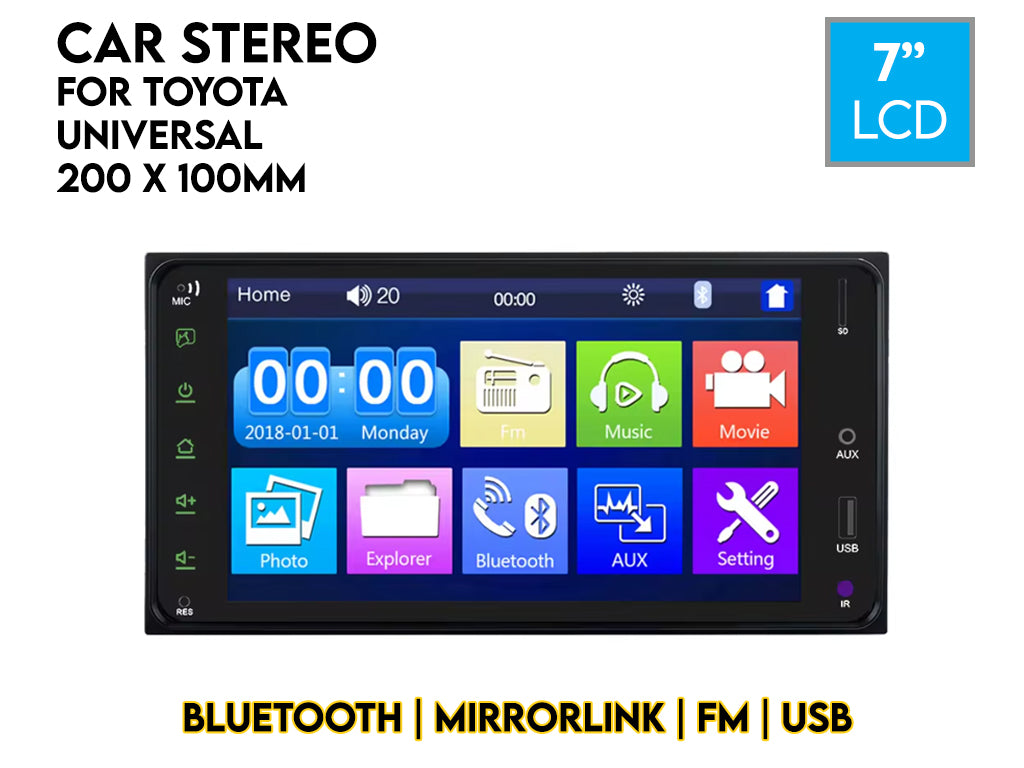 This is a Toyota compatible unit with a 200 x 100mm front panel. It can fit many different Toyota models such as Axio, Corolla, Camry, RAV 4, Mark X, Yaris, Hiace, Prado, Hilux, Funcargo and more. Modifications to your dash and/or frame may be required. A photo of the wiring harness is included